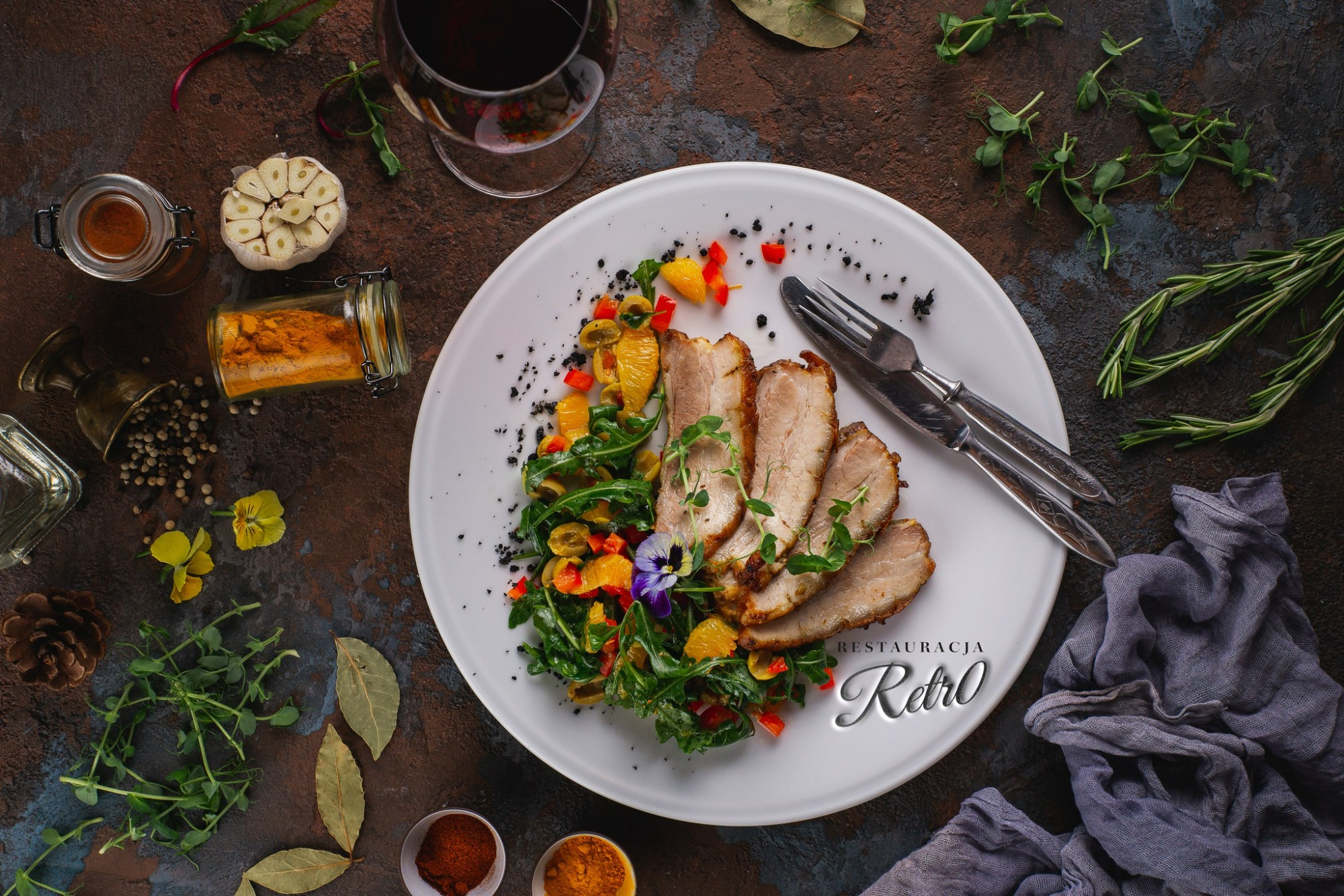 z szpinakiem i grecką fetą Ch.N.P, grillowaną papryką w sosie pieczarkowym lub pieczeniowym z surówką z czerwonej i białej kapusty -